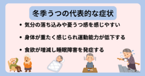 加えて、一人暮らしや家族との交流不足による孤独感が心の負担を強め、冬季うつが起こりやすい状況につながります。冬季うつは気分の落ち込みだけでなく、体や生活のリズムに幅広い影響を与えます。