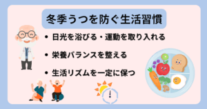 冬季うつの予防には、薬や治療だけでなく、日々の暮らし方を整えることが大切です。ここでは実践しやすい3つの工夫を紹介します。